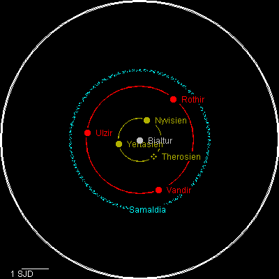 Nyvisien, Yertasien, and Therosien all occupy the same orbit, and are evenly spaced around the primary. They are all primarily inhabited by trilateral creatures of various types.