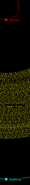 Most other asteroid belts are thin in comparison to their diameter. Even the Grinder of Greyspace is only a few thousand miles thick. In contrast, the Lagan Zone is 100 million miles thick, and just as high, giving the asteroid field the shape of a colossal donut. The field is relatively sparse, so ships can generally navigate through it with comparative ease. The largest bodies of the belt are type C.